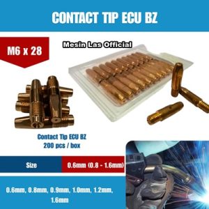 Contact tip Binzel M6x28 adalah komponen habis pakai pada torch (stang) las MIG/MAG yang berfungsi untuk menghantarkan arus listrik dari mesin las ke kawat las. Spesifikasi M6x28 merujuk pada ukuran fisik dari contact tip tersebut.