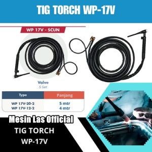 Tig Torch WP-17V adalah obor TIG (Tungsten Inert Gas) berpendingin udara yang populer dan serbaguna, dirancang untuk efisiensi dan daya tahan dalam pengelasan TIG, serta beberapa modelnya dapat juga digunakan untuk pengelasan MMA (Manual Metal Arc) atau las listrik. Obor ini umumnya memiliki desain yang kokoh dengan pegangan yang ergonomis, menggunakan bahan habis pakai (consumables) yang sama dengan model WP26, dan diberi peringkat hingga sekitar 150 Ampere DC dan 135 Ampere AC.