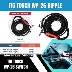 TIG Torch WP-26 adalah stang las argon atau obor TIG yang didinginkan dengan udara (air-cooled), berukuran besar, dirancang untuk pengelasan profesional dengan kemampuan menangani arus listrik tinggi (200A atau lebih). Obor ini memiliki keunggulan pada performa tinggi, daya tahan, handling ergonomis dengan grip yang baik, dan kabel fleksibel yang tahan panas. Kode “26” menunjukkan ukuran obor ini yang merupakan salah satu yang terbesar di antara obor TIG lainnya.