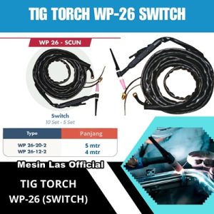 TIG Torch WP-26 adalah stang las argon atau obor TIG yang didinginkan dengan udara (air-cooled), berukuran besar, dirancang untuk pengelasan profesional dengan kemampuan menangani arus listrik tinggi (200A atau lebih). Obor ini memiliki keunggulan pada performa tinggi, daya tahan, handling ergonomis dengan grip yang baik, dan kabel fleksibel yang tahan panas. Kode “26” menunjukkan ukuran obor ini yang merupakan salah satu yang terbesar di antara obor TIG lainnya.