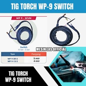 TIG Torch WP-9 adalah sebuah obor las TIG (Tungsten Inert Gas) berpendingin udara yang populer dan banyak digunakan, berfungsi untuk mengarahkan elektroda tungsten dan gas pelindung seperti Argon ke area pengelasan, serta mampu digunakan untuk berbagai jenis mesin las TIG. Model ini dikenal karena desainnya yang praktis, ergonomis, dan seringkali dilengkapi leher fleksibel untuk kontrol yang lebih baik di area yang sulit dijangkau.