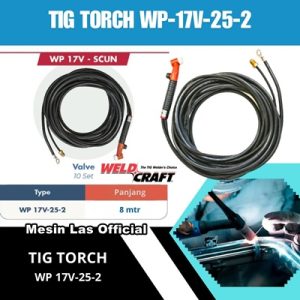TIG torch Weldcraft WP-17V adalah obor berpendingin udara yang digunakan dalam proses pengelasa TIG (Tungsten Inert Gas) untuk menghasilkan panas dari elektroda tungsten dan meleburkan logam secara bersamaan, dengan “V” pada modelnya menunjukkan adanya katup gas yang terintegrasi untuk mengendalikan aliran gas pelindung, memastikan proses pengelasan yang bersih dan efektif.