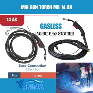 MIG Gun MB-14 adalah nama model atau merek spesifik dari sebuah pistol atau torch (obor) mesin las MIG/MAG, dengan “MB-14” sebagai kode modelnya. Fungsi utama dari MIG gun adalah untuk mengalirkan kawat las elektroda dan gas pelindung ke area pengelasan saat menggunakan proses pengelasan Metal Inert Gas (MIG) atau Metal Active Gas (MAG). MB-14 ini di rancang khusus untuk mesin las tipe gasless.