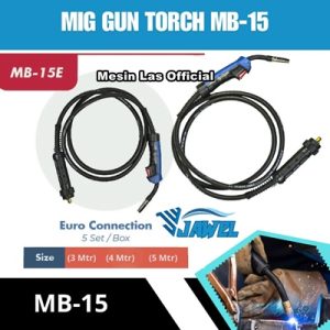 MIG gun MB-15 (juga dikenal sebagai obor las MIG MB15AK) adalah alat yang digunakan dalam proses pengelasan MIG (Metal Inert Gas) yang berfungsi untuk menyalurkan kawat las elektroda dan gas pelindung secara bersamaan ke area pengelasan. Obor ini dirancang ergonomis untuk kenyamanan dan mengurangi kelelahan operator, memiliki pendinginan optimal untuk memperpanjang umur alat, dan cocok untuk aplikasi ringan hingga menengah dengan kapasitas arus hingga 180 Ampere.