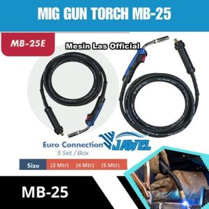 MIG Gun MB25 adalah jenis tangkai atau obor las berpendingin udara yang digunakan untuk proses pengelasan MIG/MAG (Gas Metal Arc Welding). Angka “25” pada namanya mengacu pada kapasitasnya, yang mampu menangani arus listrik hingga sekitar 250 ampere.