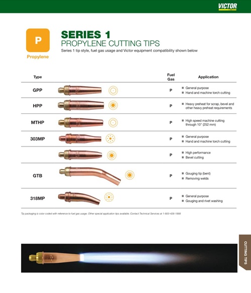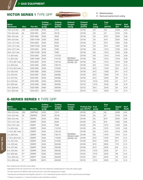 Cutting tip Victor tersedia dalam berbagai ukuran dan model, disesuaikan dengan jenis gas yang digunakan (misalnya, LPG atau asetilen) dan ketebalan material yang akan dipotong. Ukuran cutting tip seringkali ditandai dengan nomor, seperti 1-GPN, 2-GPN, dst., yang menunjukkan kapasitas pemotongan.